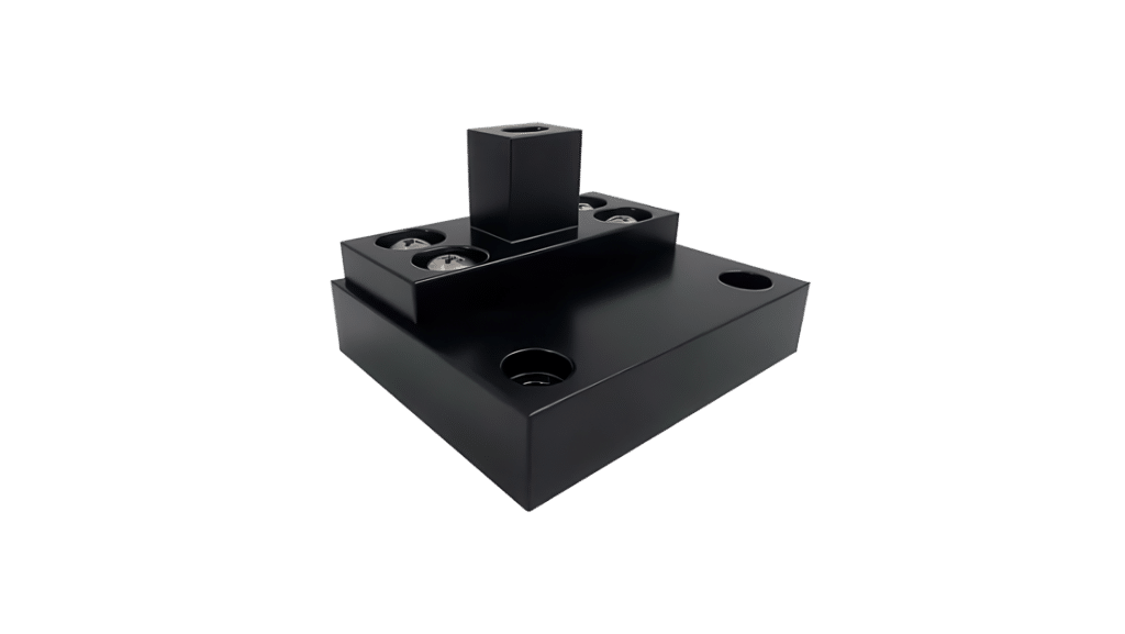 The AFP is made of marine grade stainless steel and has two components. The solid base measures 3-5/16” x 4” x 7/8” and attaches to the slab structure with four 3-1/4” concrete screws. The top section is 7/16″ thick and is bolted to the base with four 1/4” x 1/2” stainless machine screws that allow ample adjustment before securing. Once the finished floor is completed, the lower portion is completely hidden inside the panel bottom rail.